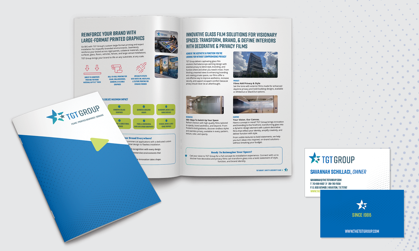 The TGT Group is the trusted design partner with expertise in specialty glass films, custom wall finishes, architectural solutions, and large-format printing. As the TGT Group moved to new ownership and expanded their offerings, their branding called for a more modern design and representative of where they are headed. At the same time, they wanted the new logo to feel connected to the previous design. We brought new life to the star, created a lively and fresh color palette and expanded their collateral.